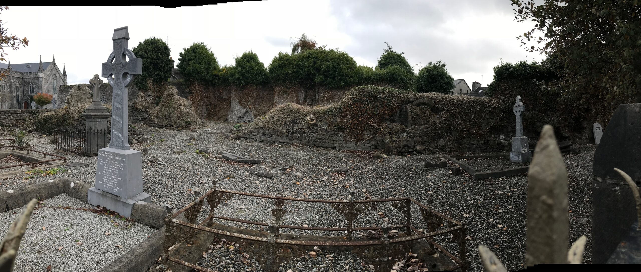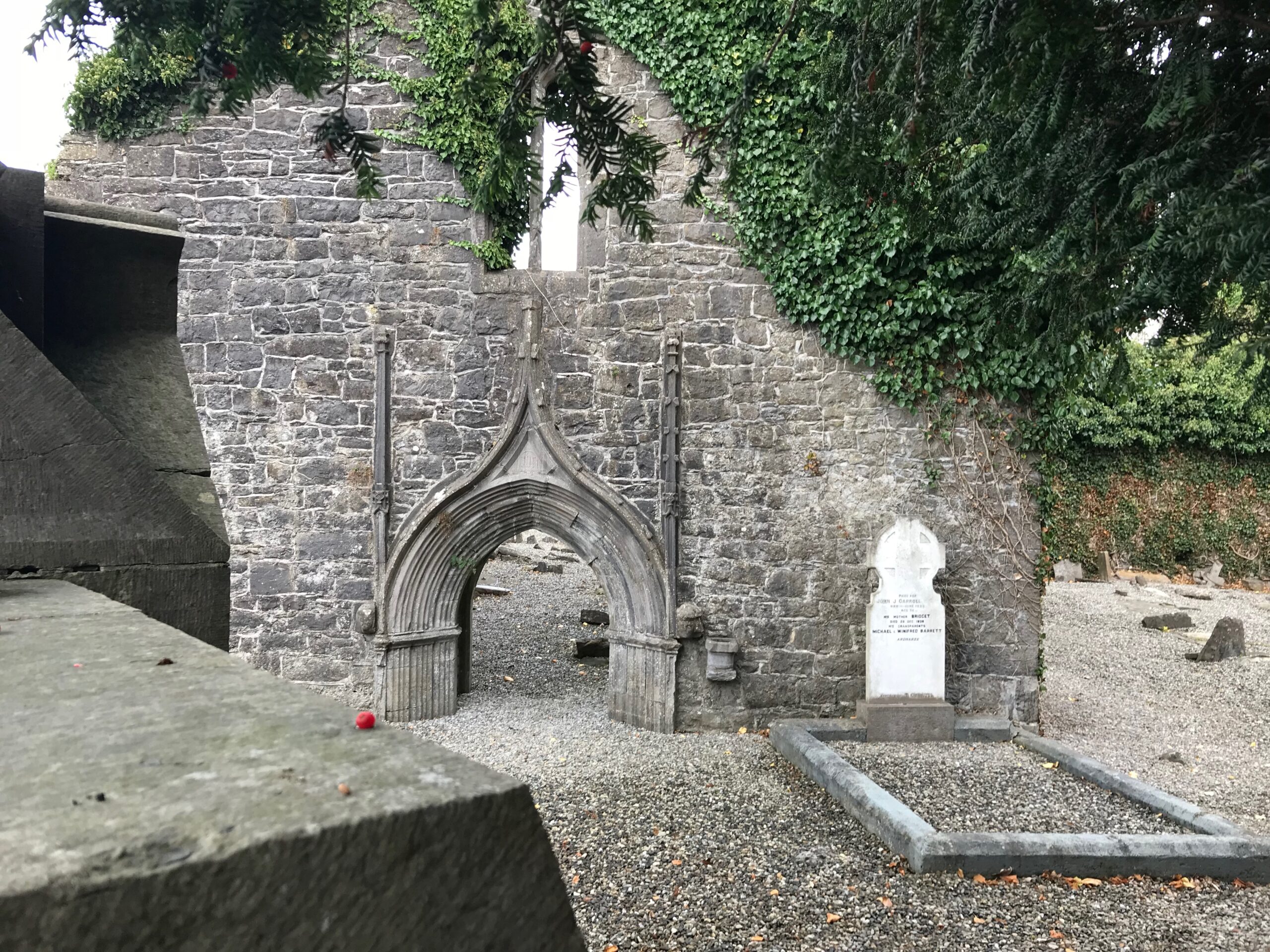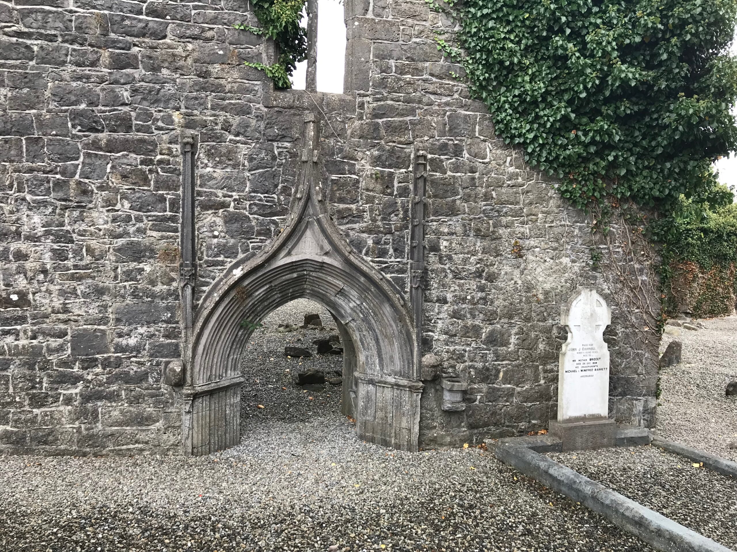 While much of the abbey has been lost to time, a striking Gothic pointed arch and a section of the original stone wall still stand — a haunting reminder of the scale and craftsmanship of the medieval building. The arch, with its finely carved stonework, marks what was likely the main entrance or a significant internal doorway of the abbey church. The surrounding graveyard, with its headstones spanning several centuries, remains as a tangible link to the community that gathered here.