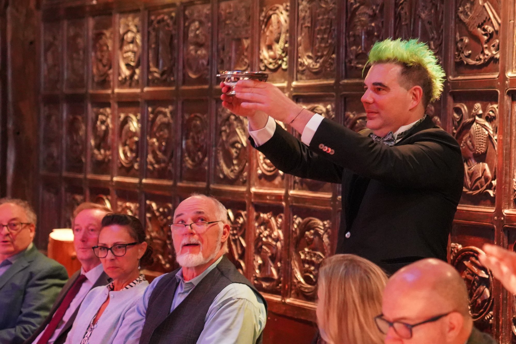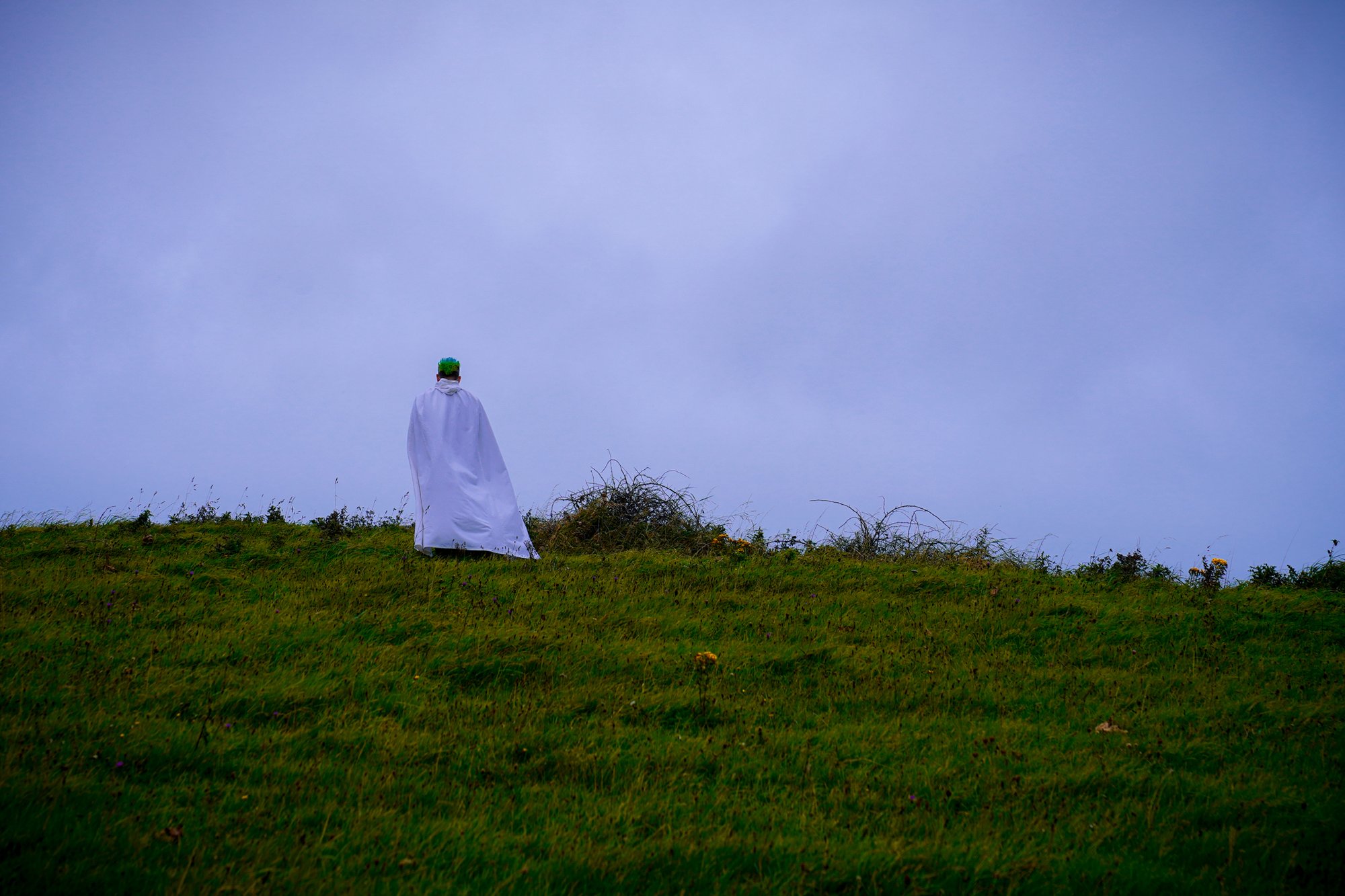 Sean O'Dowda Stephens raises the White Wand on the old mound